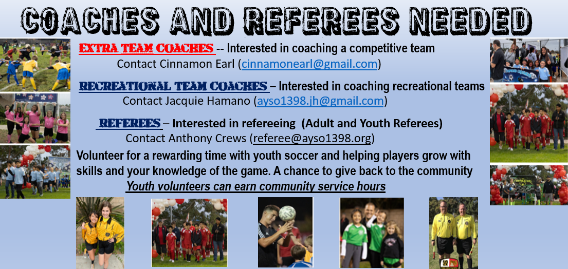 AYSO is an all-volunteer organization and we need YOUR help to support youth soccer for our kids!