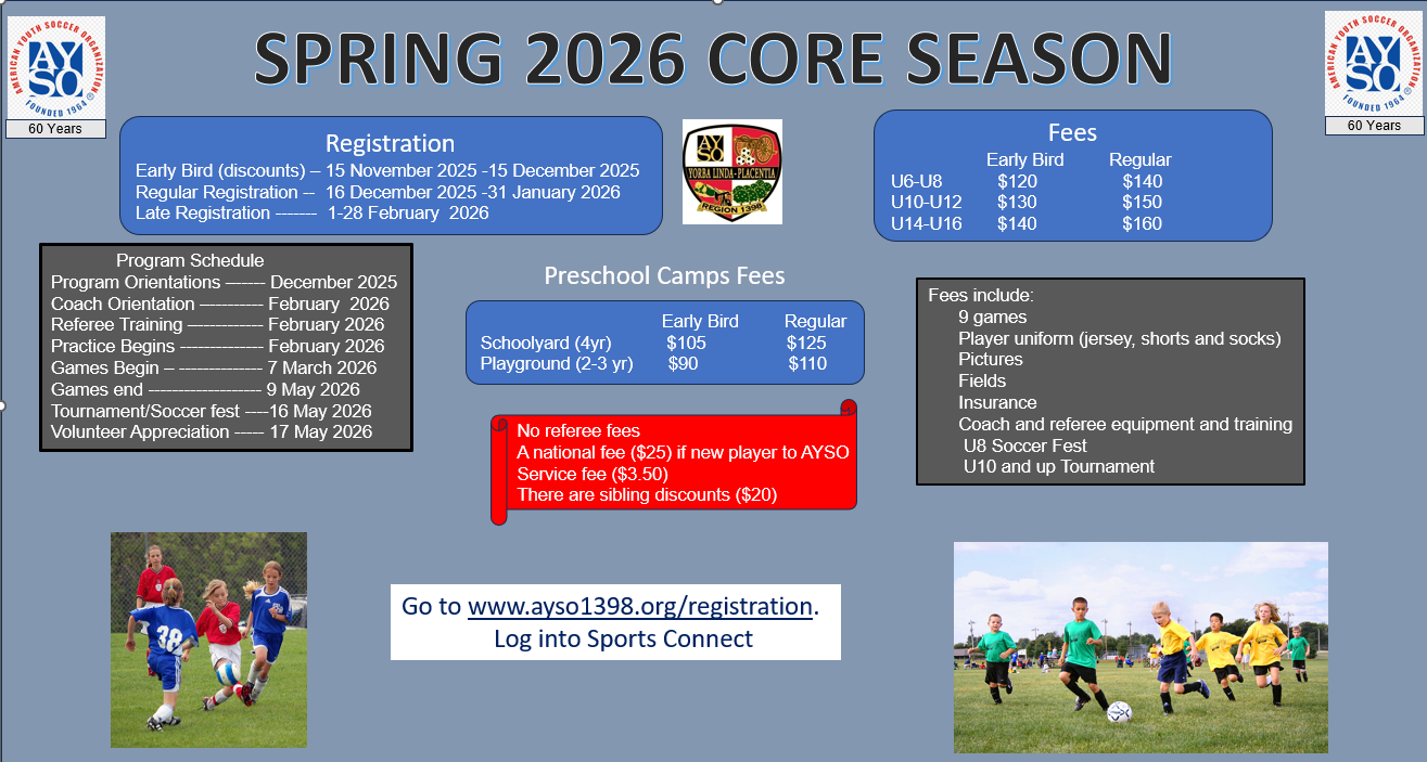 The Fall Core program runs from February to May 2026. This program is for ages 5-15. (Includes U16 team teams) Registration for the Spring season is OPEN. There are discounts for multi-family players. (2nd Child - $20, 3rd child is $40, 4th child is $60)